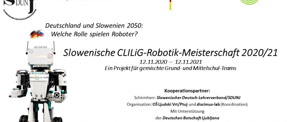 Mit dem zunehmenden Einsatz von Robotik und Künstlicher Intelligenz sind große Chancen und Herausforderungen verbunden. Das CLILiG-Projekt fördert Robotik und Deutsch als Fremdsprache für gemischte Teams aus Grund- und Mittelschulen/Gymnasien. Unter Schirmherrschaft des Slowenischen Deutsch-Lehrerverbands/SDUNJ wird das Projekt jährlich im Rahmen der Internationalen Tagungen des SDUNJ eröffnet und abgeschlossen. Das Finale des ersten Durchgangs erfolgt am 12.11.2021 bei der SDUNJ-Tagung in Ptuj; gleichzeitig erfolgt der Start ins Projektjahr 2021/22. Mit den Gewinnern der slowenischen und der parallel stattfindenen kroatischen Meisterschaft wird künftig ein Internationaler CLILiG-Robotik Wettbewerb ausgetragen werden. Mehr unter: SDUNJ – Schaurein_2021