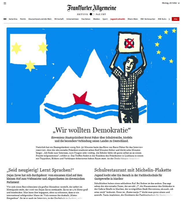 from Slovenia about Slovenia – As part of the project ” Jugend schreibt ” (“Youth writes”) with the FAZ, three features appear in the print edition on 25.07.2022; about President Borut Pahor, Dejan Zavec and the “Restavracija 7” in Maribor. The contributions were compiled with pupils from the OŠ Ljudski vrt/Ptuj, OŠ Juršinci and OŠ […]