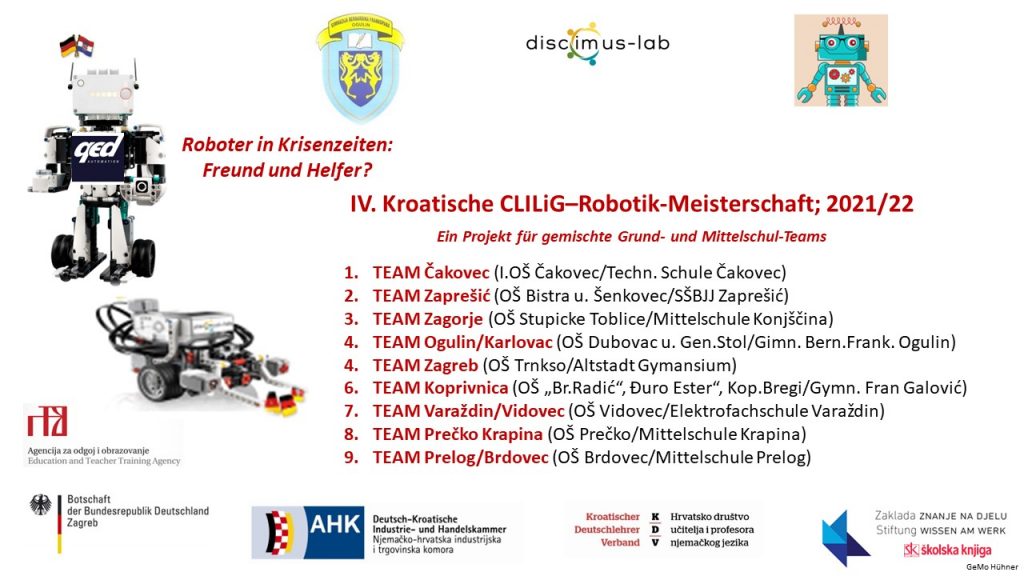 Roboter in times of crisis: Friend und Helper? The result of the IV Croatian CLILiG Robotics Championship in German is available. The award ceremony was held on 9.5.2022 atSecondary School Zaprešić. Thanks to all participating teams, supporters and Organisers! Congratulations to all the winning teams, especially the winner from Čakovec.