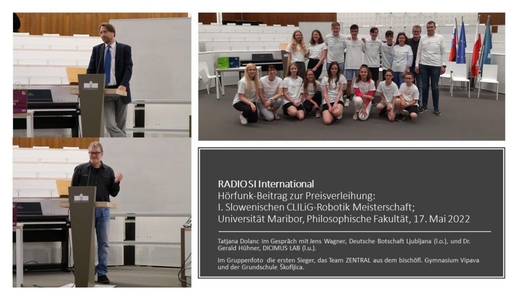 The award ceremony for the I Slovenian CLILiG Robotics Championship took place at the University of Maribor on 17.05.2022. Jens Wanger presented the prizes to 5 successful teams on behalf of the German Embassy Ljubljana. The main prize, two Lego Mindstorms robots, went to Team Central (OŠ Skofljica/Gimn. Vipava). Congratulations and thanks to all participating […]
