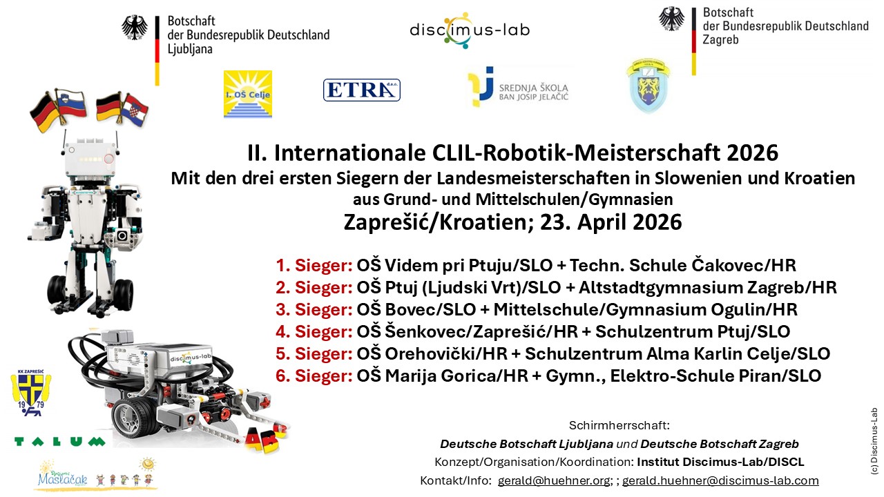 Nach sieben kroatischen, fünf slowenischen und zwei internationalen CLILiG-Robotik Meisterschaften planen wir eine Neu-Strukturierung des Projekts. Für Vorschläge und Unterstützung dazu danken wir sehr. Konzept/Projektleitung: INSTITUT DISCIMUS LAB